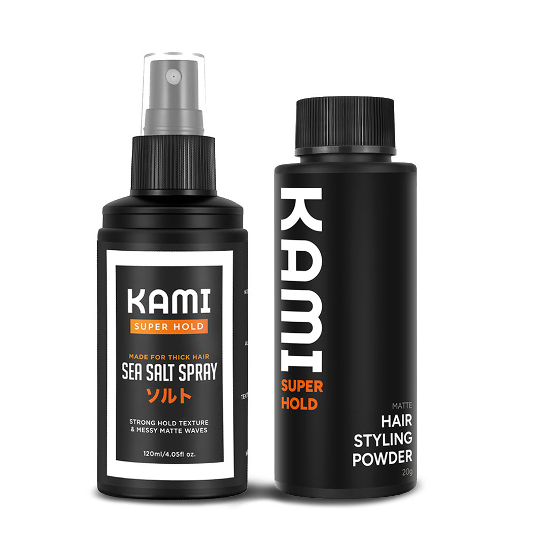 Specially formulated for men with thick and coarse hair. Kami hairstyling powder and Kami sea salt spray is the perfect power combo to add natural texture, volume and messy hair styles. This powder combo is a great replacement for hairspray. Long lasting hairstyling combination for men with thick and unruly hair.